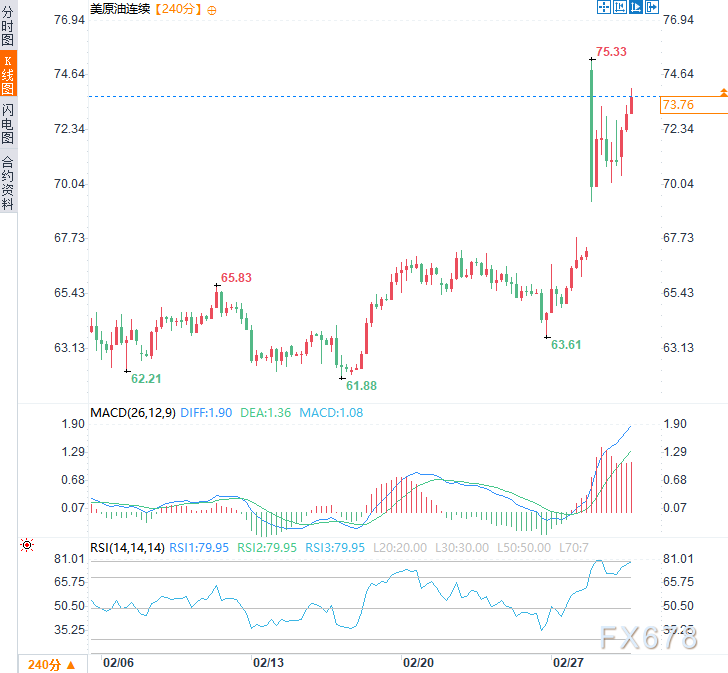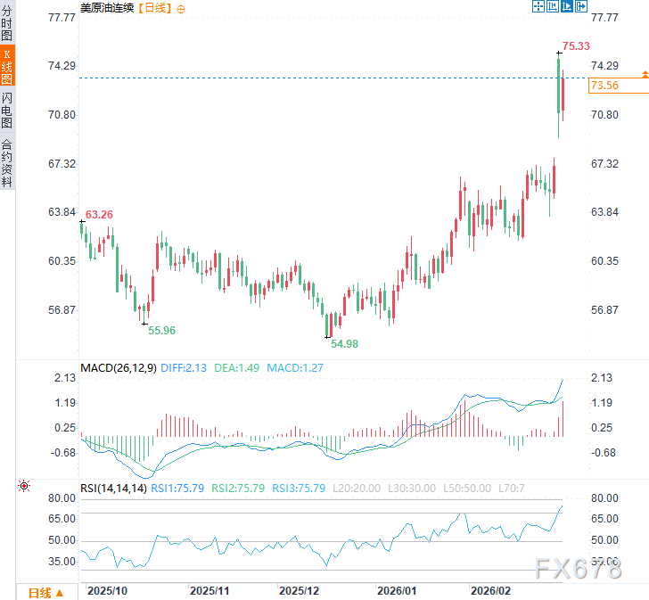 冲突升级引发全球避险情绪飙升。日本东证指数跌幅扩大至2%,韩国KOSPI指数下跌超3%;A股三大指数集体回调,沪指、深证成指、创业板指均跌逾1%,下跌个股近4200只。道指微跌,纳指和标普500小幅反弹,但整体成交活跃于能源、国防板块。美元指数一度走强至1月20日高点98.98,周一(3月2日)美原油价格一度跳涨逾12%,触及75.33美元/桶的近九个月高点,周二美原油价格震荡上行,现交投于每桶74.00美元附近,日内涨幅约3.85%。